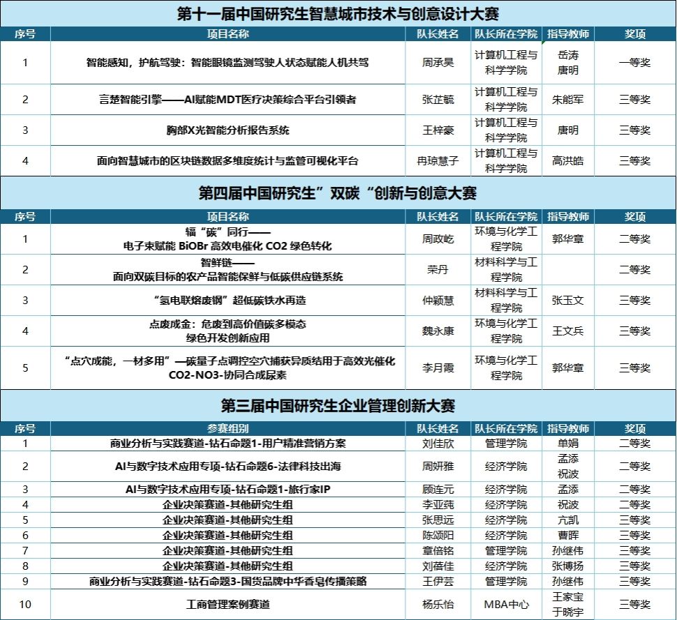 近日,“中国研究生创新实践系列大赛”多个赛事落下帷幕,我校研究生在第十一届中国研究生智慧城市技术与创意设计大赛、第四届中国研究生“双碳”创新与创意大赛和第三届中国研究生企业管理创新大赛中捷报连连、屡创佳绩,共斩获19项大奖!